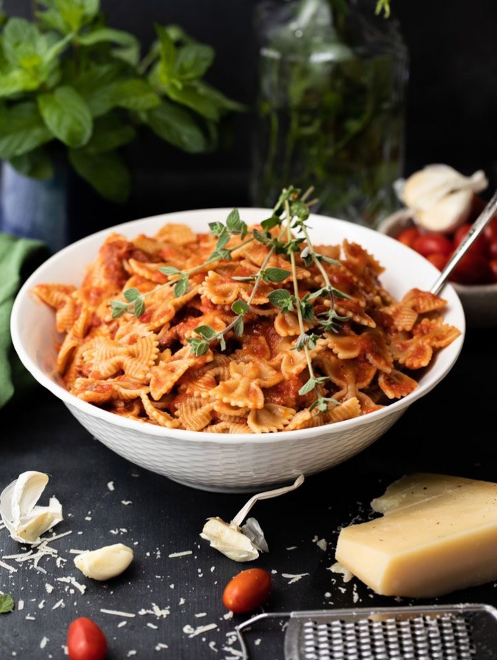 4. Εν τω μεταξύ, σε μία μεγάλη κατσαρόλα με αλατισμένο νερό που κοχλάζει έντονα μαγειρεύουμε τα ζυμαρικά σύμφωνα με τις οδηγίες συσκευασίας. Στραγγίζουμε και ανακατεύουμε τα στραγγισμένα ζυμαρικά με τη σάλτσα και την παρμεζάνα. Βάζουμε από πάνω τα κλωνάρια φρέσκιας ρίγανης και πασπαλίζουμε με έξτρα τριμμένη παρμεζάνα, αν θέλουμε.