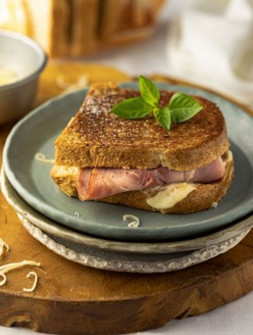 4. Ζεσταίνουμε ένα αντικολλητικό τηγάνι που διαθέτει καπάκι σε μέτρια φωτιά. Τοποθετούμε το σάντουιτς στο τηγάνι. Ψήνουμε για 3-4 λεπτά την κάθε πλευρά έχοντας το τηγάνι καλυμμένο.