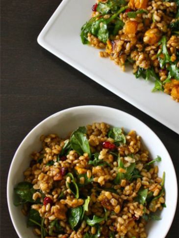 2.Σε ένα πιάτο σερβιρίσματος βάζουμε σαν βάση τα φύλλα σπανάκι, σκορπάμε επάνω το κριθάρι, τo πορτοκάλι και τα φιστίκια.